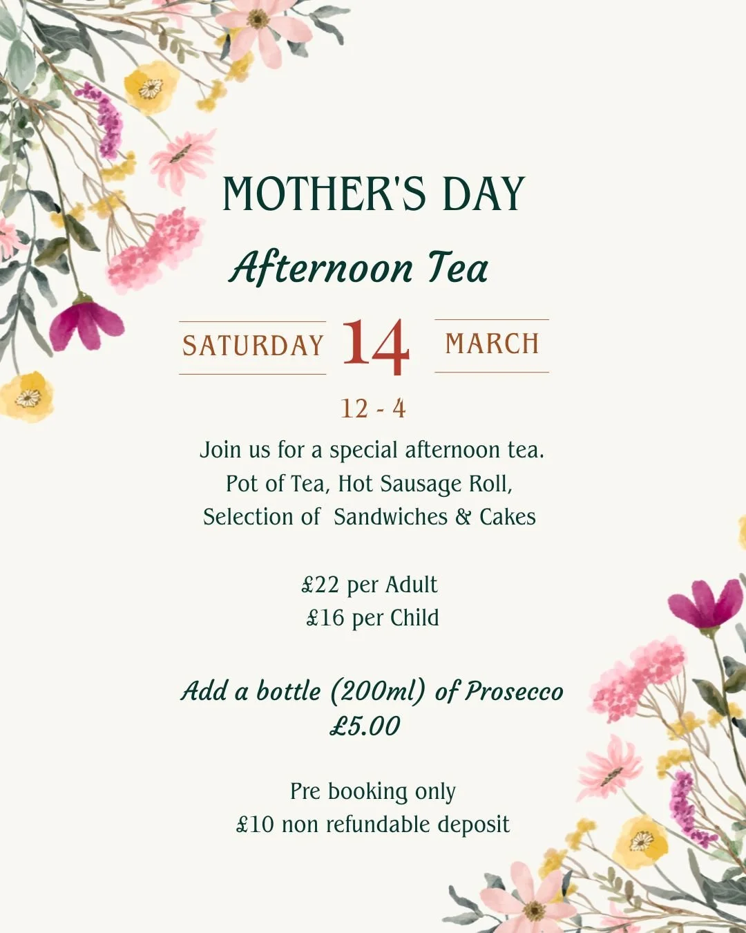 Join us on Mothering Sunday. Bookings now being taken from 12pm.