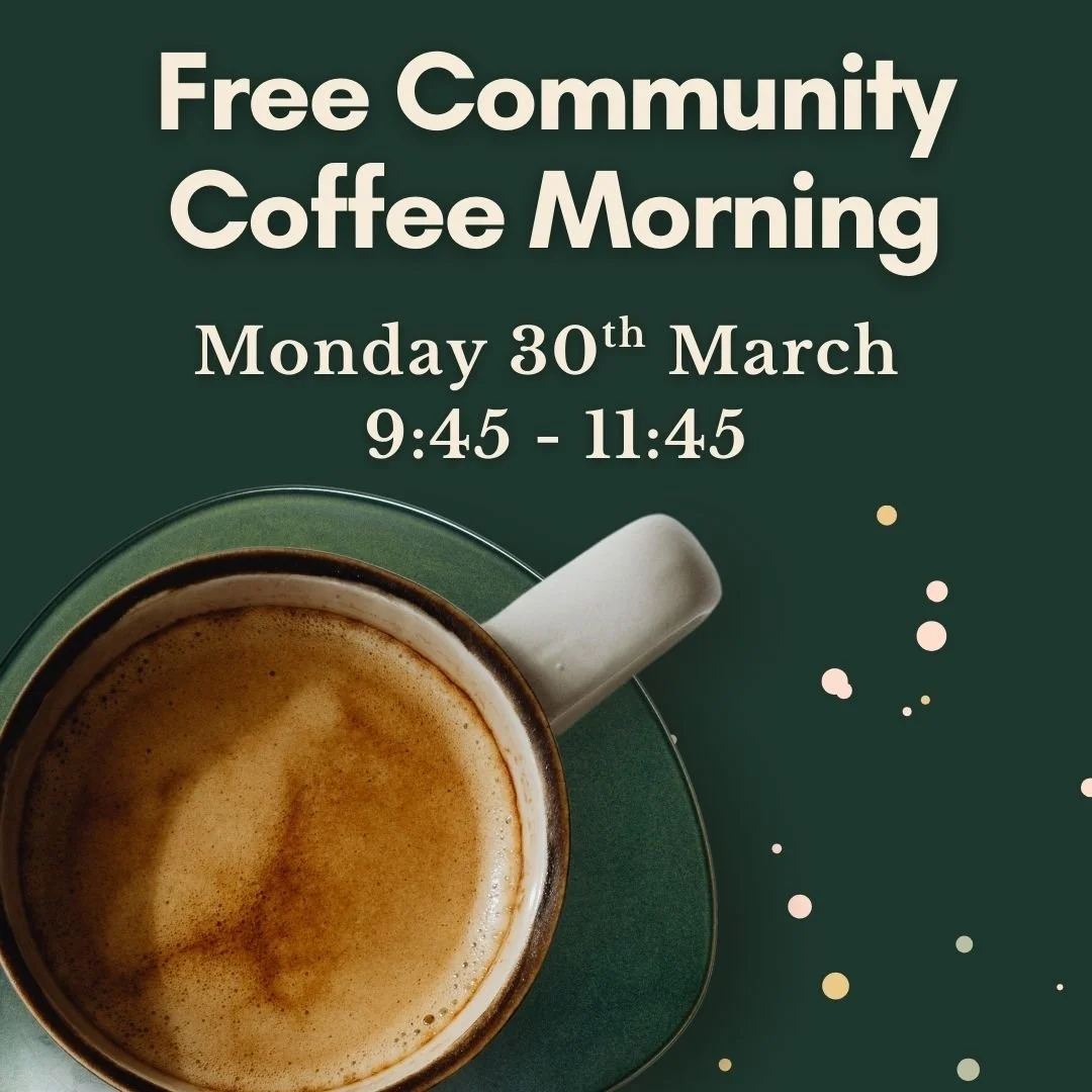 Come along to our Free Community Coffee Morning Monday 30th March 9:45 - 11:45am. Enjoy a cuppa, a slice of cake, and a good chat - all free and open to everyone.